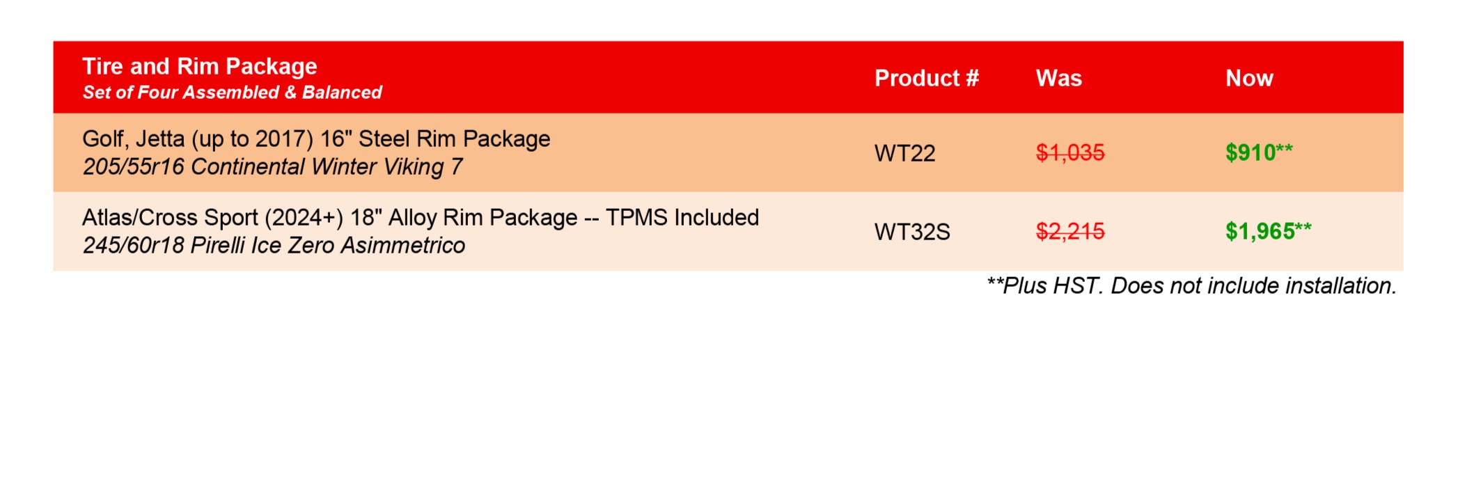 - Starting from $910.00 +HST, plus FREE Tire storage.